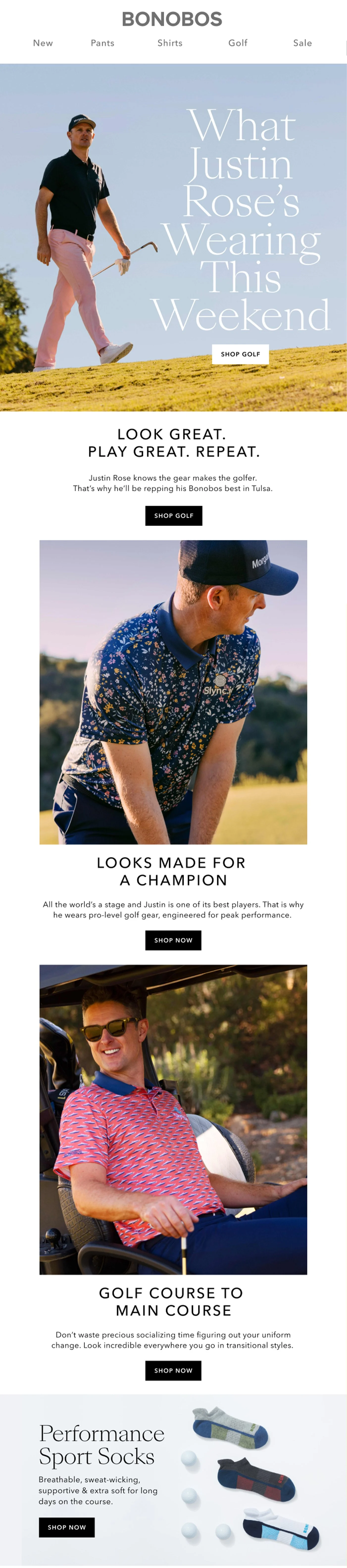 Pro-Golfer Justin Rose knows you have to look your best to play your best. That’s why he reps Bonobos golf gear wherever his tour takes him.